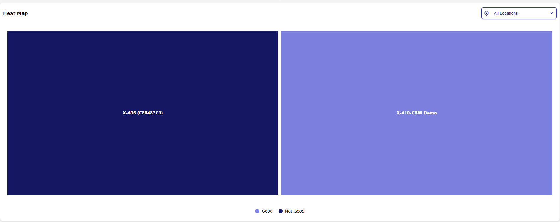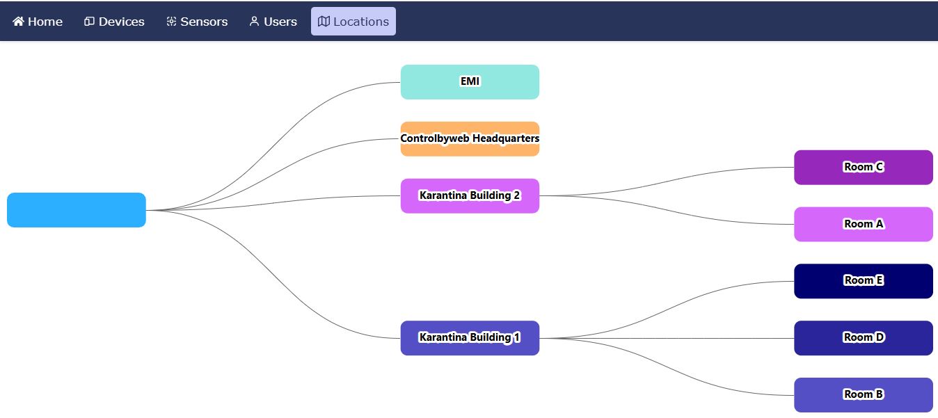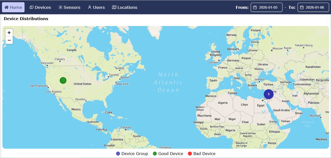 Map View Displays all devices on an interactive map with color-coded status indicators. Users can click any device to view its sensors, real-time values and historical data. |