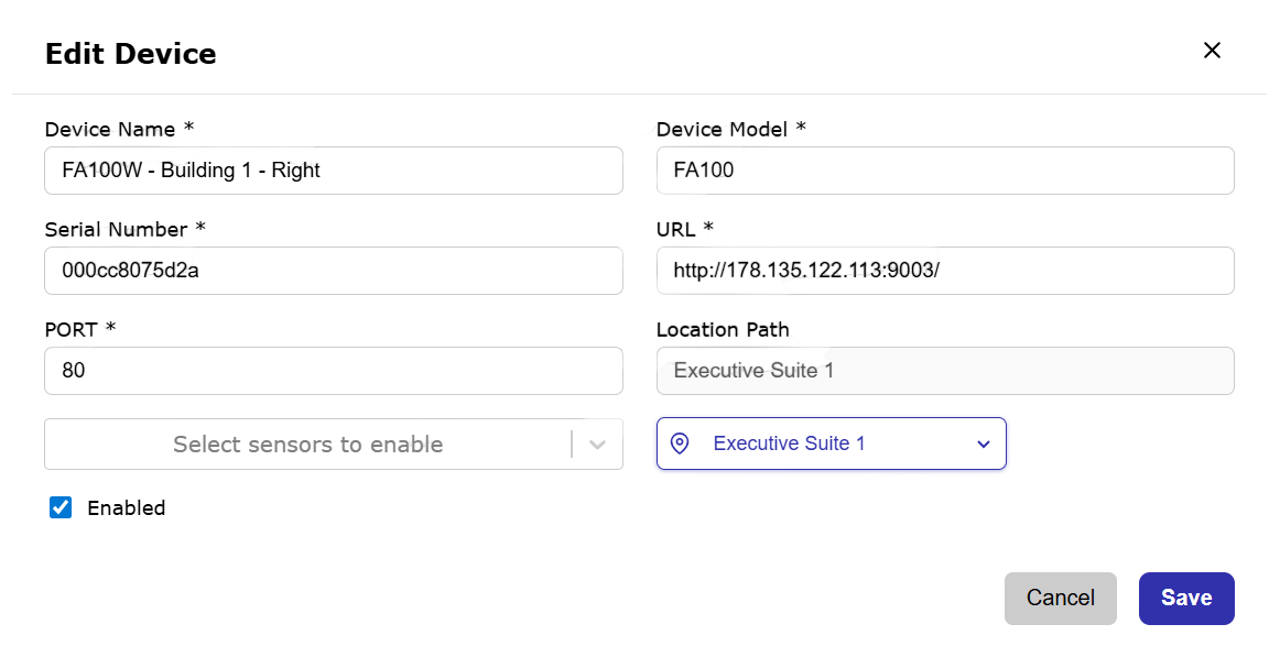 Device view: A summary table of the device attributes (Model number, Serial number, IP Address, Location, number of sensors connected)