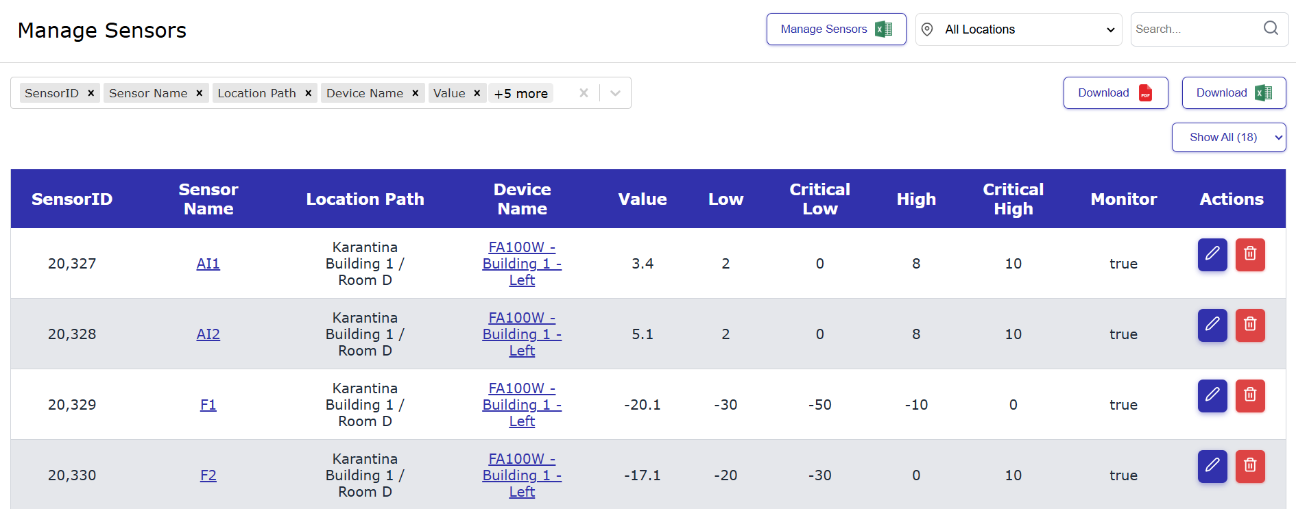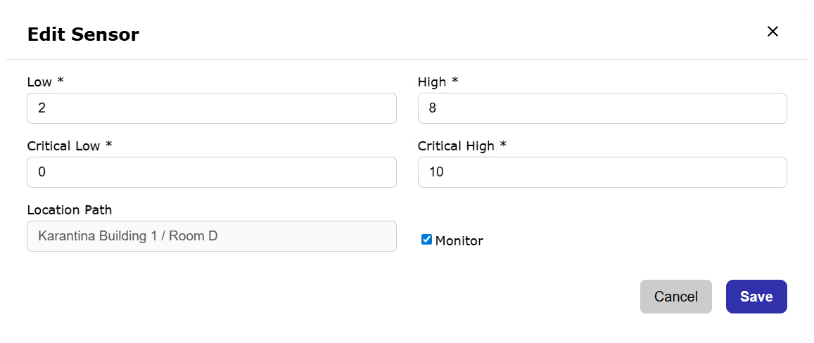 Manage sensors: Table summary of all sensors and associated attributes with the ability to set alarm thresholds