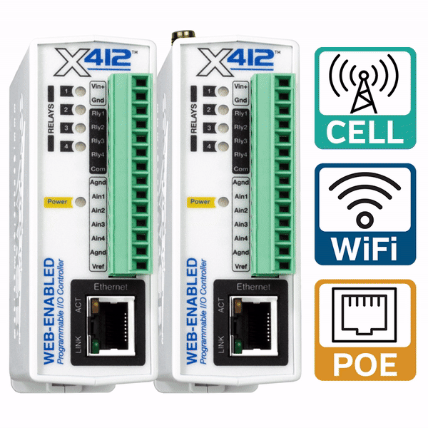 This powerful Ethernet I/O PLC offers 4 analog inputs and 4 relays, all controlled through a built-in web server. Experience limitless control and monitoring for your applications. Upgrade today!The X-412 has the same features as our most popular relay controllers combined with analog data capture. It’s a flexible relay module that’s ideal for applications such as measuring liquid levels, flow rates, and other parameters that require real-time visibility. It is a versatile Ethernet module with four analog inputs and four relays, ideal for sensor data acquisition and control logic in applications like motors and lighting control. Accessed through a web browser with no additional software required, it communicates using common protocols like Modbus TCP/IP and HTTP/S, compatible with SCADA software, PLCs, and other systems.